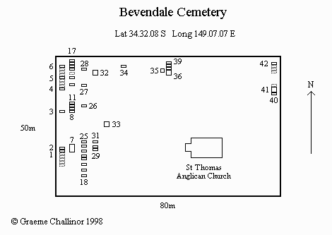 This Cemetery is at the Anglican Church of St Thomas, Bevendale. Lat 34.32.08S Long 149.07.07E