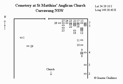 The Cemetery is situated about 30km south-west of Goulburn at Lat 34 59 10 S, Long 149 30 40 E