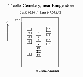 This small cemetery is on private property at Turalla which is 1.5 km west of Bungendore. It is located about 400m south of the road to Gundaroo at Lat 35.05.10 S Long 149.26.15E.